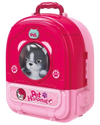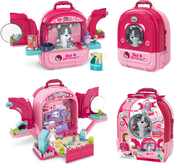 Tento set obsahuje až 64 dielikov, ktoré zahŕňajú všetko potrebné pre starostlivosť o zvieratká a veterinárnu prax: domček pre domáce zvieratá, podnos na kŕmenie, bazén, veža pre mačky, nožnice, hrebeň, krmivo pre mačky a psov, lekársku súpravu, vyšetrovacie lôžko, stetoskop, závesnú fľašu, rastliny v črepníkoch, nálepky, plot a ďalšie doplnky. Súčasťou je aj praktický batoh, ktorý umožňuje ľahkú a pohodlnú prepravu všetkých komponentov.