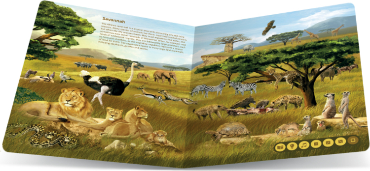 The book will guide you thematically through eight different environments on our planet, such as forest, savannah, desert, sea, and more. On each page, you will learn what animals live in each respective environment, what their names are, what sounds they make, and what makes them interesting. You can then test your knowledge with fun quizzes, which are always divided into three categories: find an animal by its name, find an animal by the sound that it makes and find an animal by some interesting fact that you have just learnt.