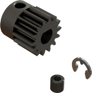 Tuningový diel pre RC modely áut Arrma 3S 4WD Bigrock, Granite, Senton, Typhon: pastorok 14T 0.8M Safe-D5. Otvor pre hriadeľ s plôškou v tvare D zaistí pevné spojenie aj keď sa uvoľní pastorok.