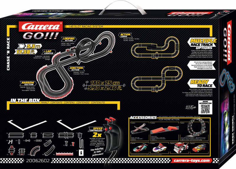 Autodráha Carrera GO!!! dhlá 5,3 m s autami Hypercars, obsahuje križovatku, rovinky, zákruty, kolmú stenu, zúženie dráhy, looping, diel s počítadlom kôl a ďalšie časti. Môžete si postaviť ďalšie rôzne trate podľa svojej fantázie.