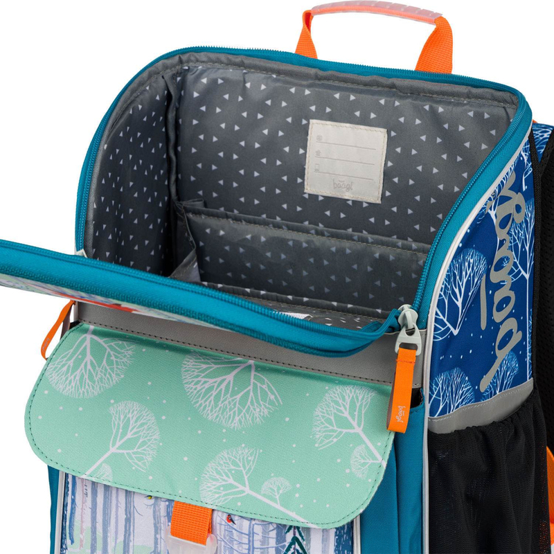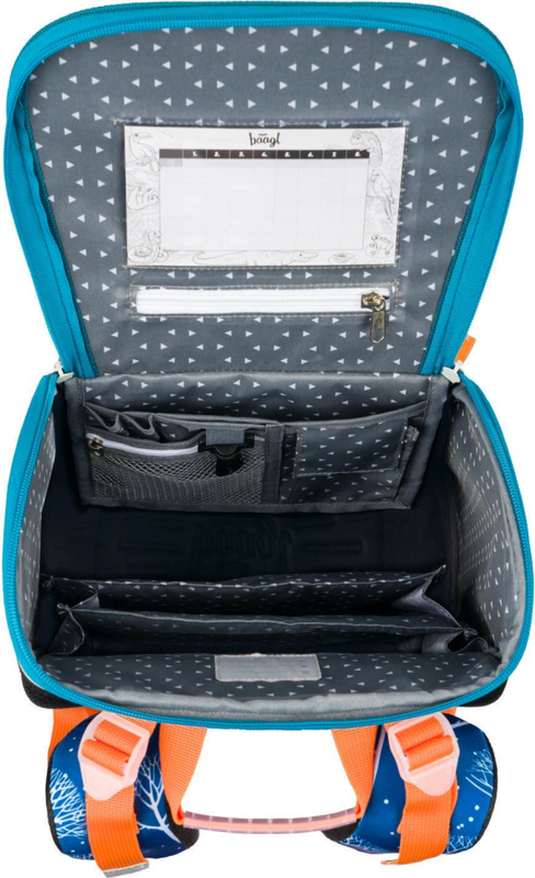 • Vnútri aktovky je priehľadná kapsa s rozvrhom a vnútorný organizér umožňujúci rovnomerné rozloženie hmotnosti doplnený gumičkou kvôli fixácii.