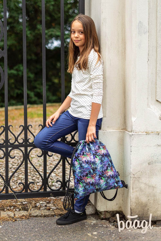 Vrecko na cvičky alebo prezuvky z pevného umývateľného materiálu.• Zaťahovanie pomocou pevných šnúrok, ktoré zároveň umožňujú nosenie na chrbte.
