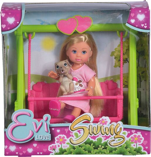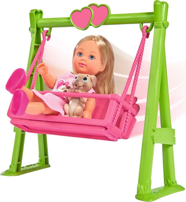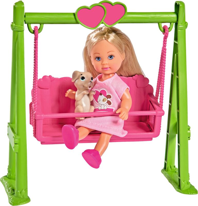 Bábika Evička a jej roztomilý psík, so záhradnou hojdačkou.