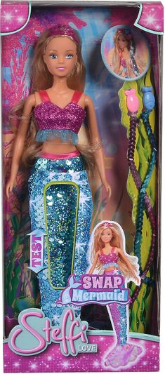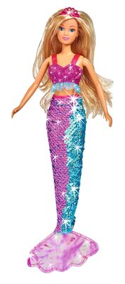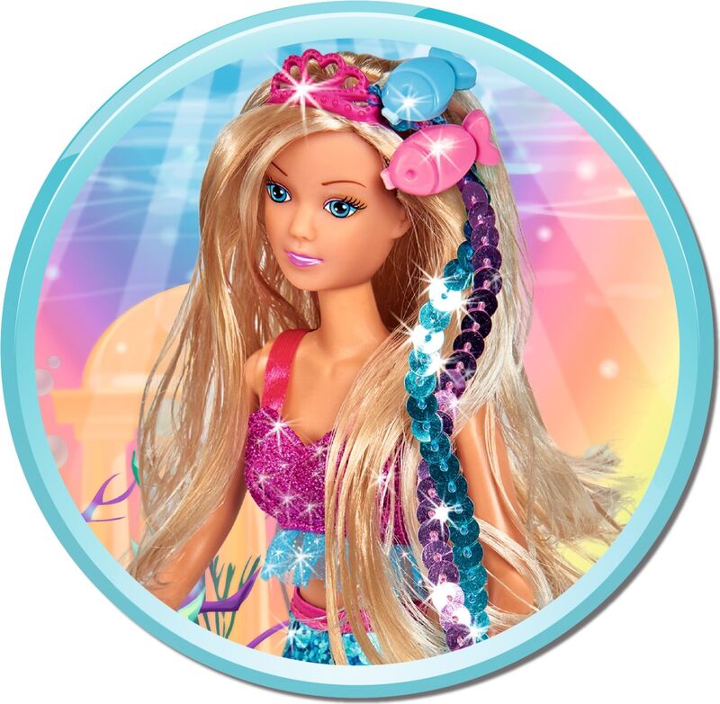 Bábika Steffi ako morská panna s dvomi pripínacími vlasovými prameňmi a s plutvou z farebných flitrov so swap efektom.Veľkosť 29 cm.