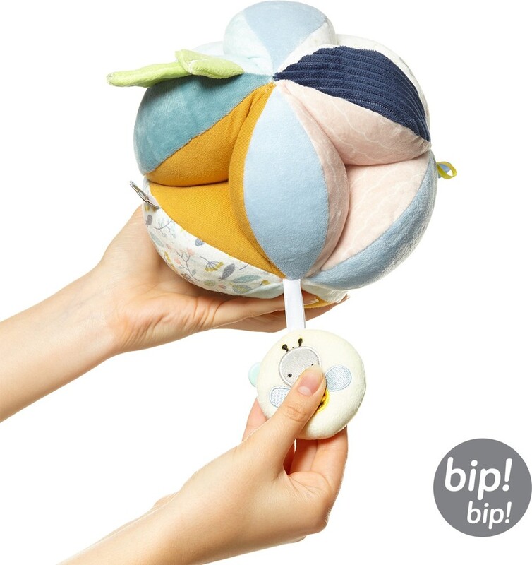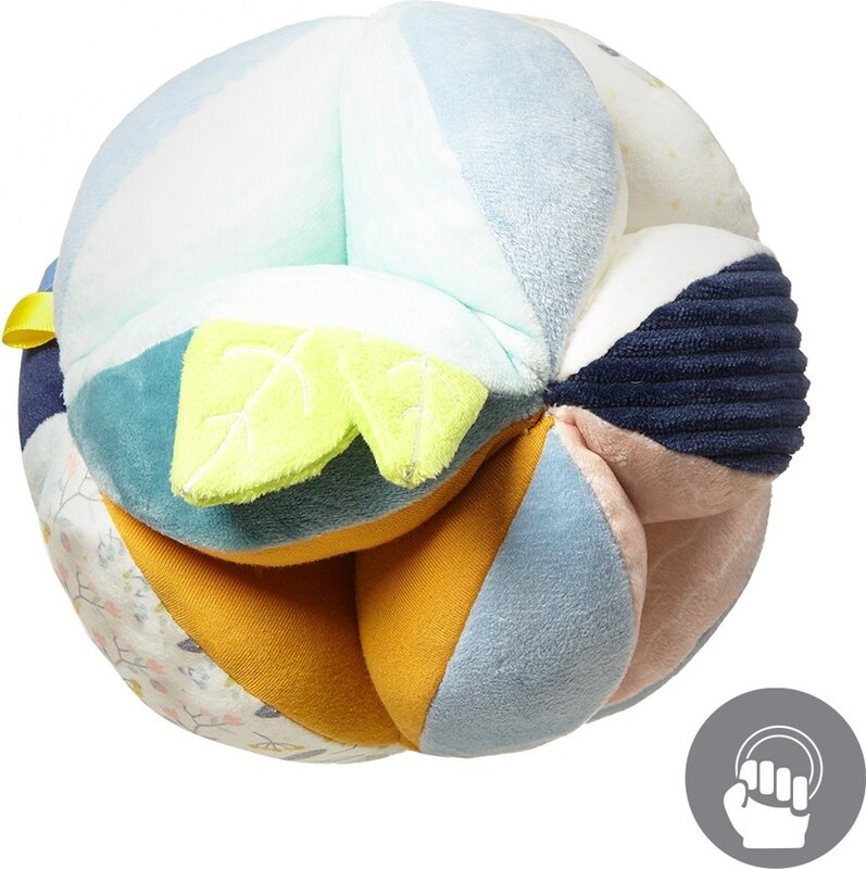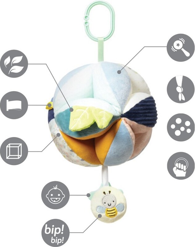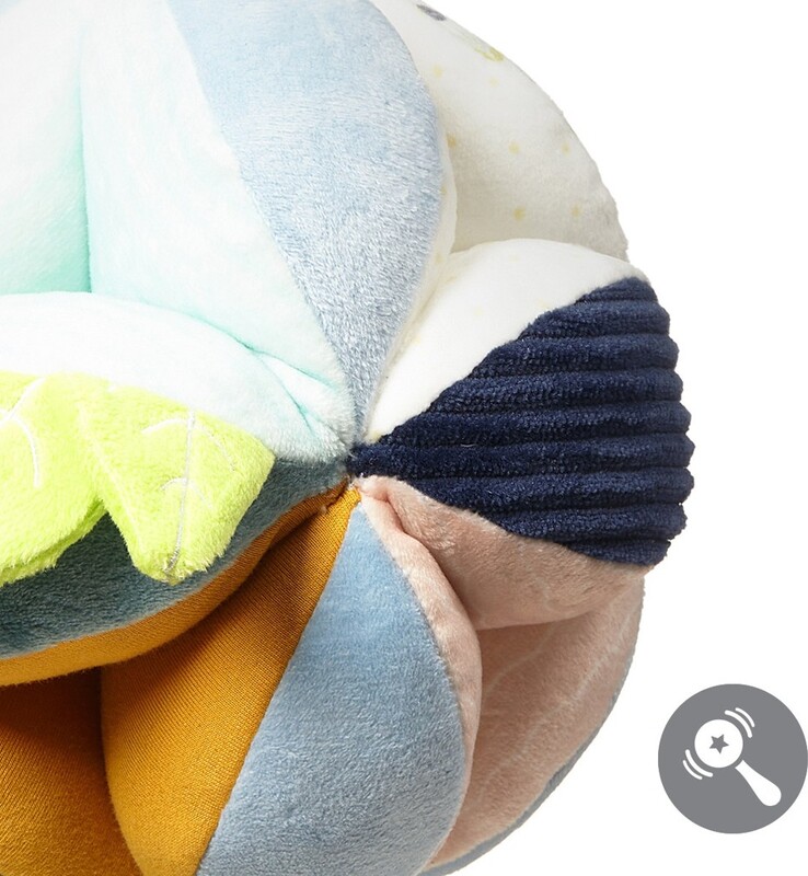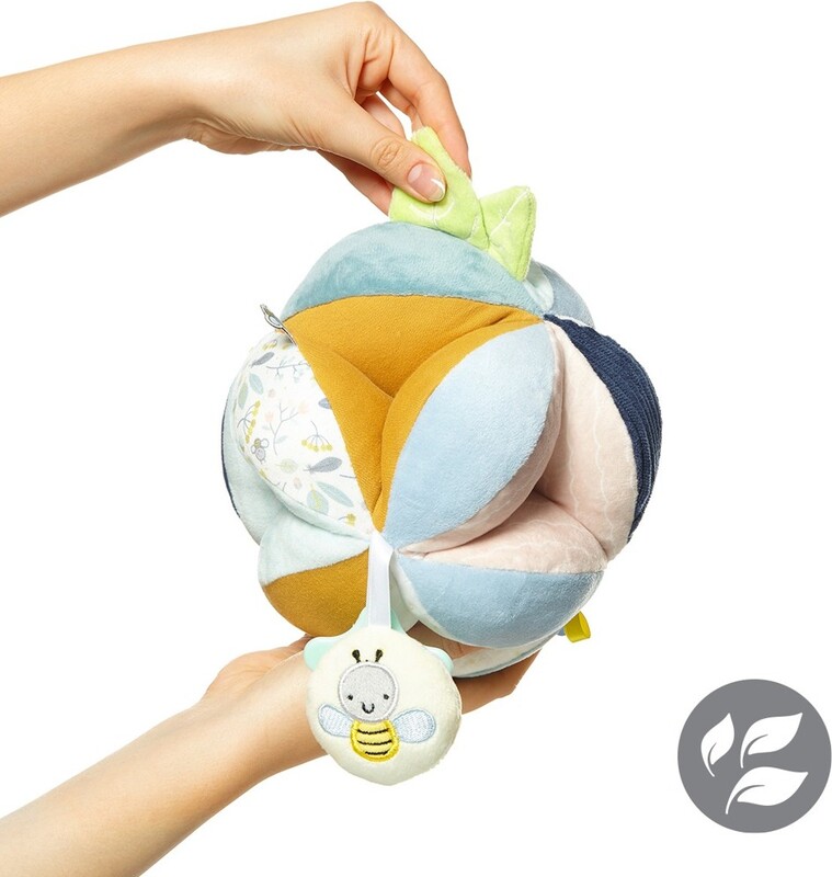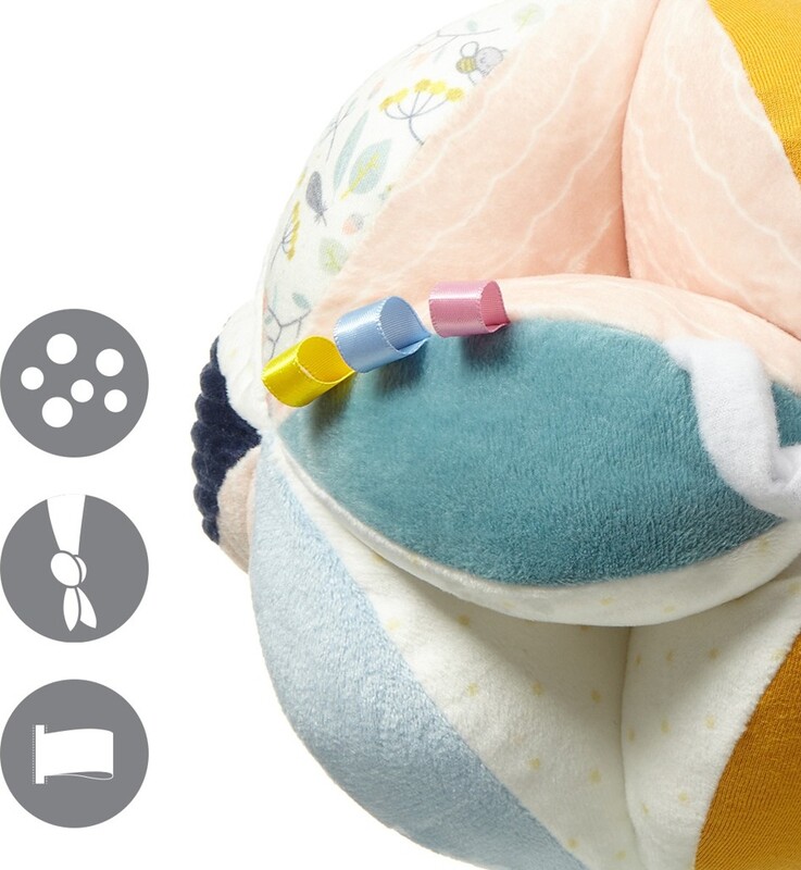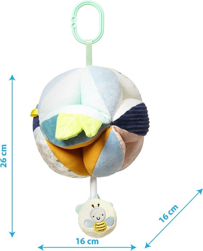 Šuštiace prvky umiestnené v hračke dieťa zaujmú a upútajú jeho pozornosť. Farebné, vyčnievajúce stužky a zaujímavé uzlíky stimulujú hmat dieťaťa. Hrkajúci zvuk pôsobí na dieťatko upokojujúco. Lopta je vďaka svojmu okrúhlemu tvaru vhodná na učenie sa chytať a uchopovať základné tvary. Hračka je vyrobená z kvalitných materiálov s dôrazom na každý detail Hračka spĺňa bezpečnostné normy platné v Európskej únii