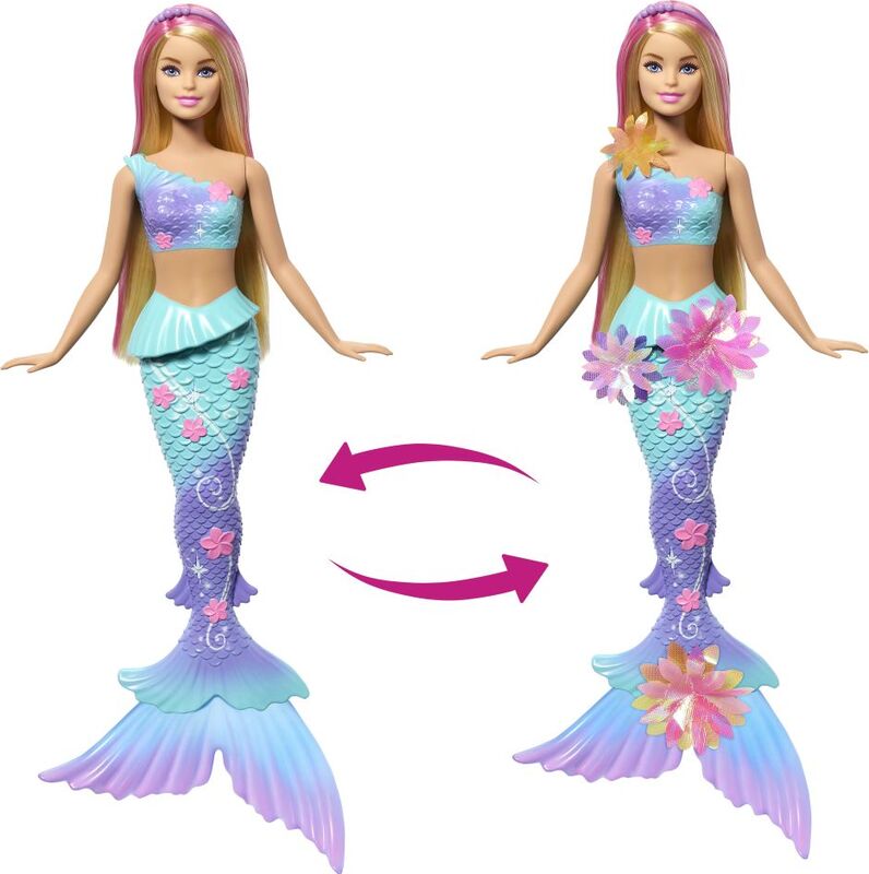S dúhovými kvetmi, ombré plutvami a doplnkom v podobe perlovej čelenky v dlhých blond vlasoch s ružovým melírom - táto bábika Barbie morská panna je úplne očarujúce! Bábika nemôže stáť ani plávať sama. Farby a vzhľad výrobku sa môžu líšiť.