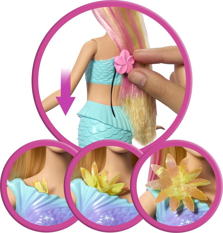 Posunutím páčky na jej chrbte uvidíte, ako jej kvety kúzelne „rozkvitajú“ od živôtiku až po jej plutvy, a to stále dookola.Deti sa s ňou môžu hrať na súši aj pod vodou, aby sa im na slnku alebo v mori naskytla nádherná prehliadka kvetov.