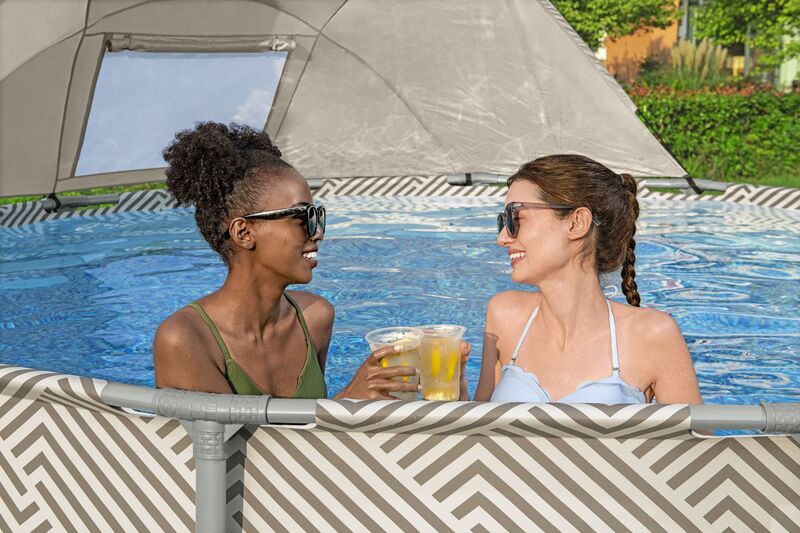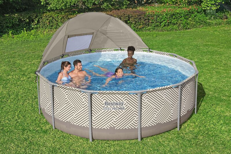 Nadzemný bazén Bestway® Steel Pro MAX™ s pôsobivým priemerom 396 cm a výškou 107 cm premení vašu záhradu na dokonalú letnú oázu. Tento kompletný set ponúka veľkorysý priestor pre celú rodinu a vyniká modernou, vysoko kontrastnou Op Art grafikou s elegantným dnom s mozaikovou potlačou. Unikátnym prvkom výbavy je odnímateľná slnečná strieška, ktorá poskytuje komfortnú ochranu pred priamym slnečným žiarením počas horúcich dní.