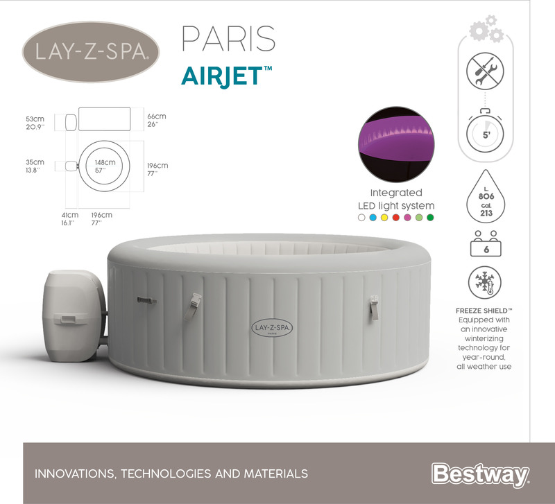 S okrúhlym LAY-Z-SPA® Paris AirJet™ v sivobielej farbe vám odovzdáme kľúč od vašej vírivky (196 x 66 cm), ktorú si môžete vychutnať až so 6 osobami. O skvelú atmosféru sa postará aj LED pásik s diaľkovým ovládaním.