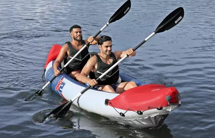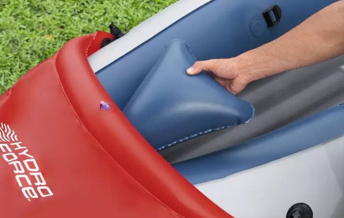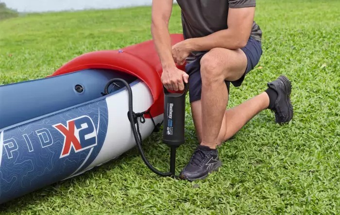 Súčasťou dodávky je pár hliníkových pádiel s dĺžkou 230 cm, ktoré sú robustné a ľahké, ako aj ručná pumpa Air Hammer™ na bezproblémové nafúknutie kajaku.