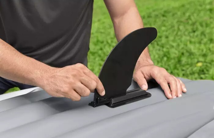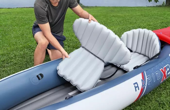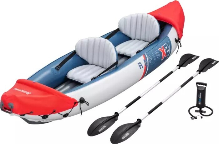 Súprava kajaku Rapid™ X2 sa dodáva s dvoma odnímateľnými plutvami pre lepšie sledovanie a ovládanie. Držadlá na prenášanie umožňujú jednoduchú prepravu, zatiaľ čo vypúšťací ventil uľahčuje rýchle vyprázdnenie kajaku.