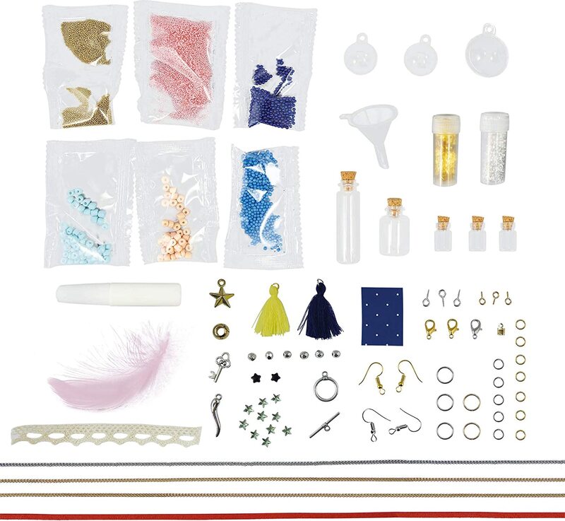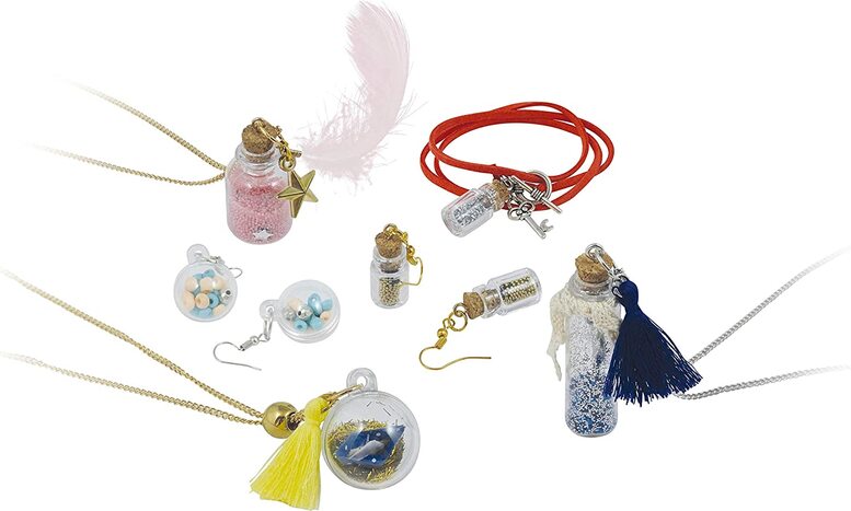Súprava obsahuje postup a materiál (fľaštičky, korálky, prívesky, spojovacie komponenty) na výrobu šiestich módnych doplnkov – náramky, náhrdelník, náušnice, prívesky.