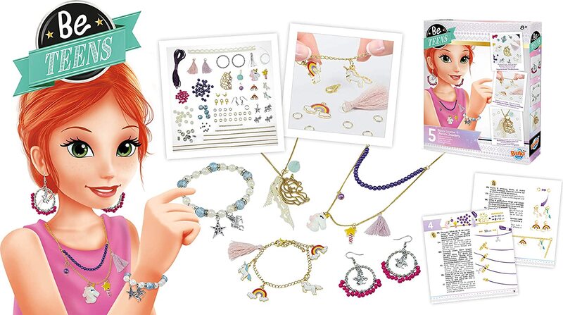 Sady BeTeens sú určené pre kreatívne dievčatá, ktoré chcú byť originálne a vlastné šperky si samy vyrobiť/vytvoriť. Súprava Šperky s jednorožcami obsahuje postup a príslušenstvo na výrobu 5 šperkov s motívom jednorožcov.