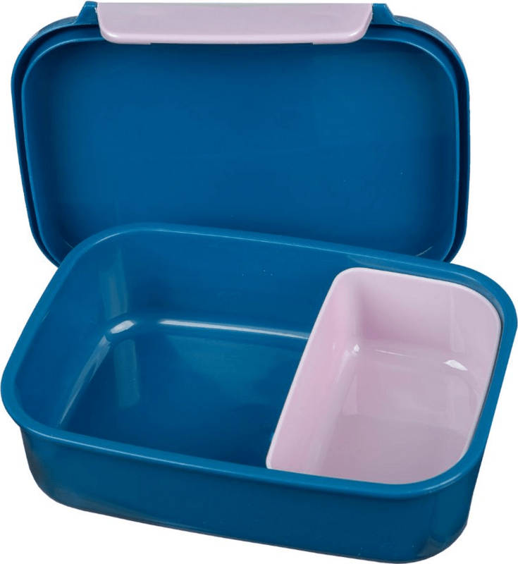 Plastová krabička na desiatu, vo vnútri s rozdeľovacou prepážkou.