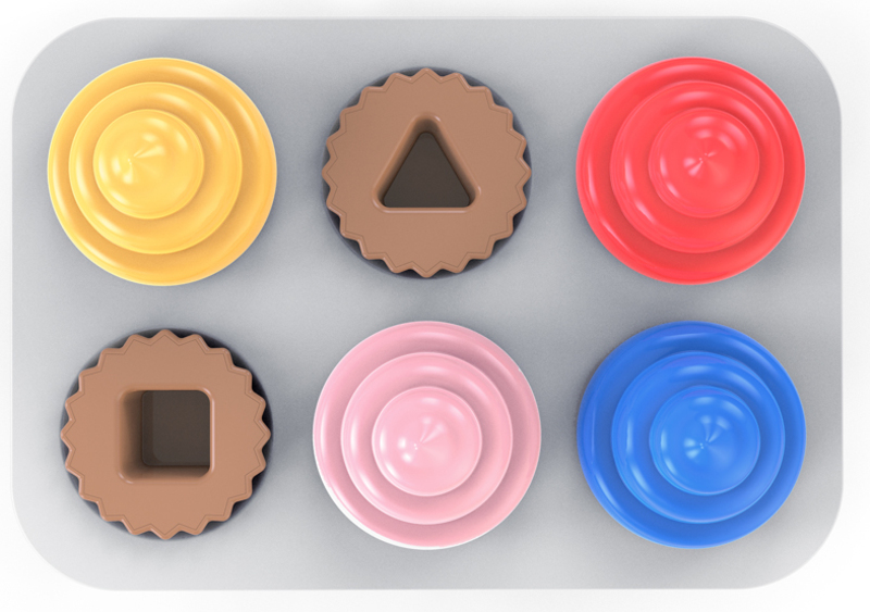 Každý zo 6 ľahko uchopiteľných košíčkov podporuje rozvoj jemných motorických zručností, keď dieťa objavuje rôzne tvary ako štvorce, trojuholníky, kruhy a ďalšie. Ku každému košíčku priraďte vrchnú časť polevy a uložte košíček na plech s výrezom rovnakého tvaru. Objavte množstvo farieb a znova a znova precvičujte tvary.
