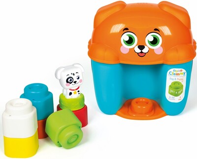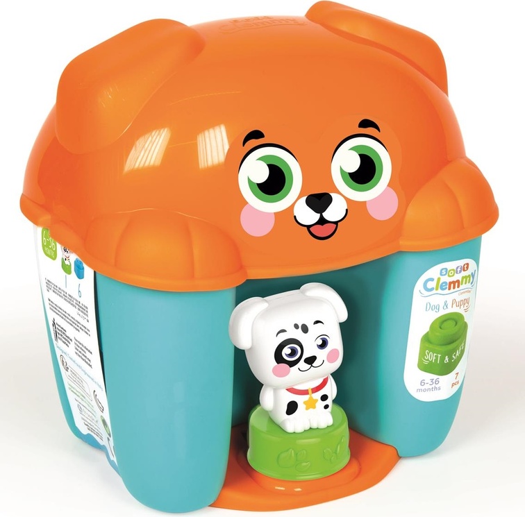 Súprava mäkkých farebných plastových kociek CLEMMY v plastovej krabici s vekom, ktoré poslúžia ako základňa pre stavanie. Postavička šteniatka je vo výklenku vedierka a je možné ju nasadzovať na ostatné kocky. Hra s kockami rozvíja zručnosť, zmyslové a priestorové vnímanie.