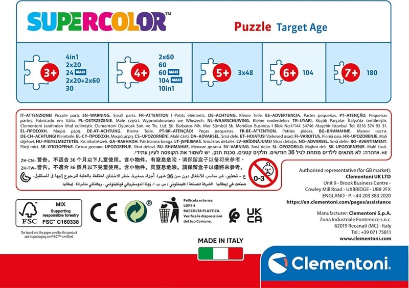 Hlavnými rysmi puzzle Clementoni je vynikajúca ostrosť, kvalita tlače, perfektne zapadajúce dieliky a robustná elegantná krabica na puzzle. Puzzle už odjakživa pomáhajú malým aj veľkým deťom rozvíjať manuálnu zručnosť navyše je obľúbenou zábavou už mnoho rokov. Výborne upúta koncentráciu, precvičuje jemnú motoriku a výborne zaplní voľný čas. Hodí sa pre všetky vekové skupiny detí i dospelých.