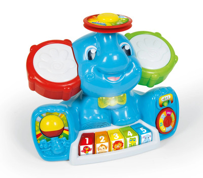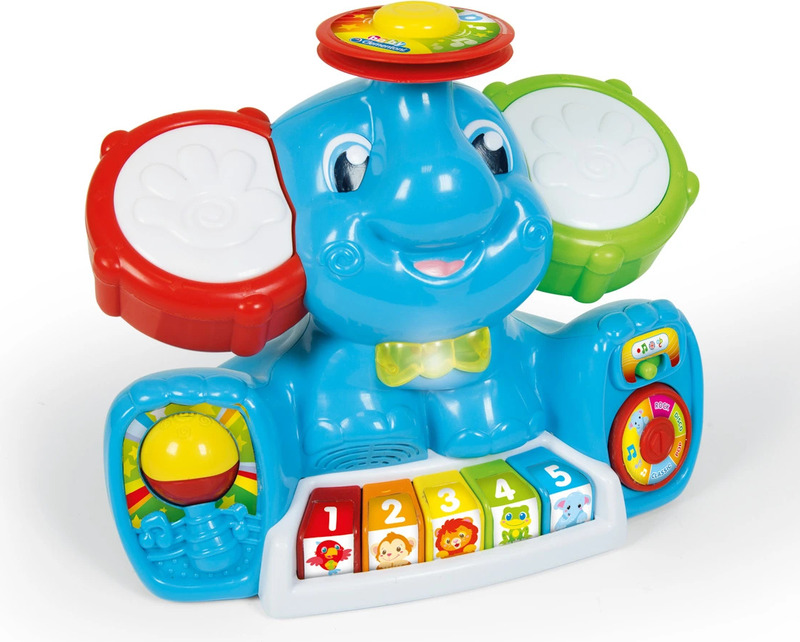Interaktívny slon so zvukmi Slon má dve veľké tamburínské uši, farebnú klávesnicu a cimbal