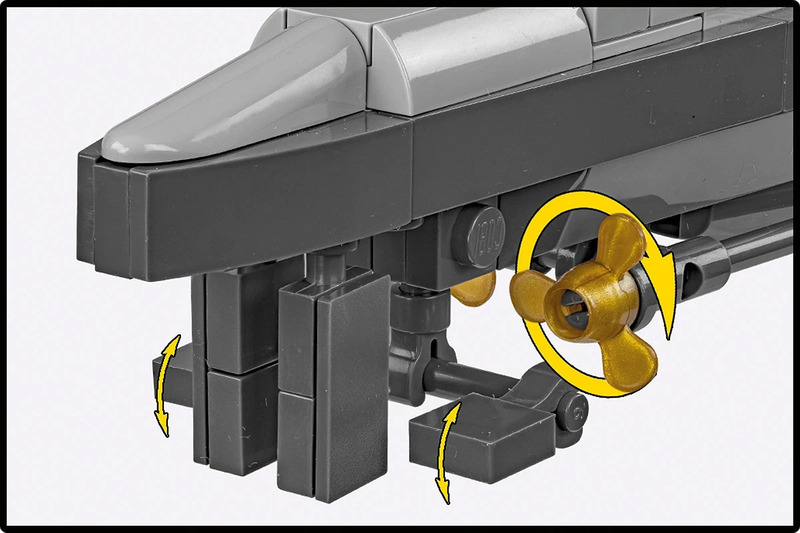 474 dielikov – Sada pozostáva z precízne navrhnutých blokov, ktoré vám umožnia vytvoriť skutočné modelárske majstrovské dielo s funkčnými, rotujúcimi vrtuľami. Každá fáza stavby je skutočným dobrodružstvom, ktoré odhaľuje nové detaily tejto ikonickej ponorky.
