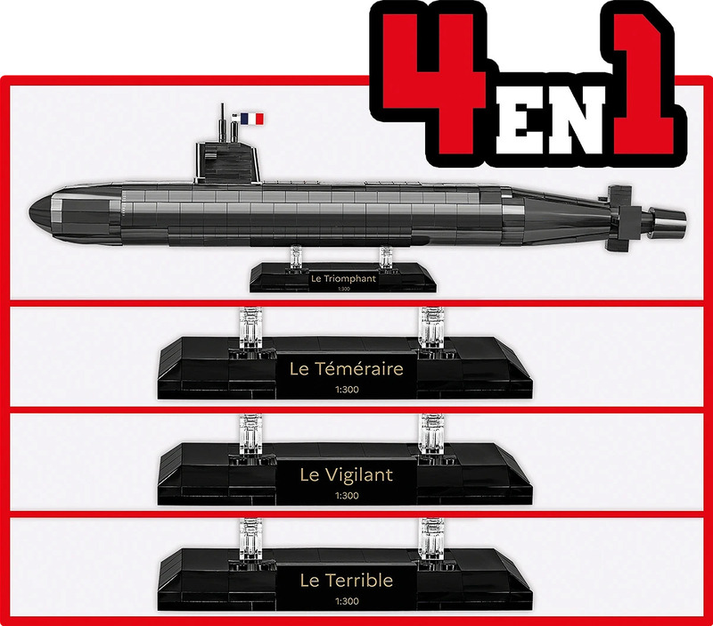 - Stojany: 4 personalizované tabuľky s názvami francúzskych SSBN (Le Triomphant, Le Téméraire, Le Vigilant, Le Terrible)