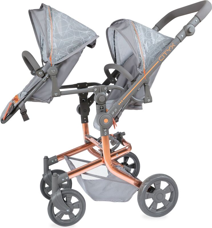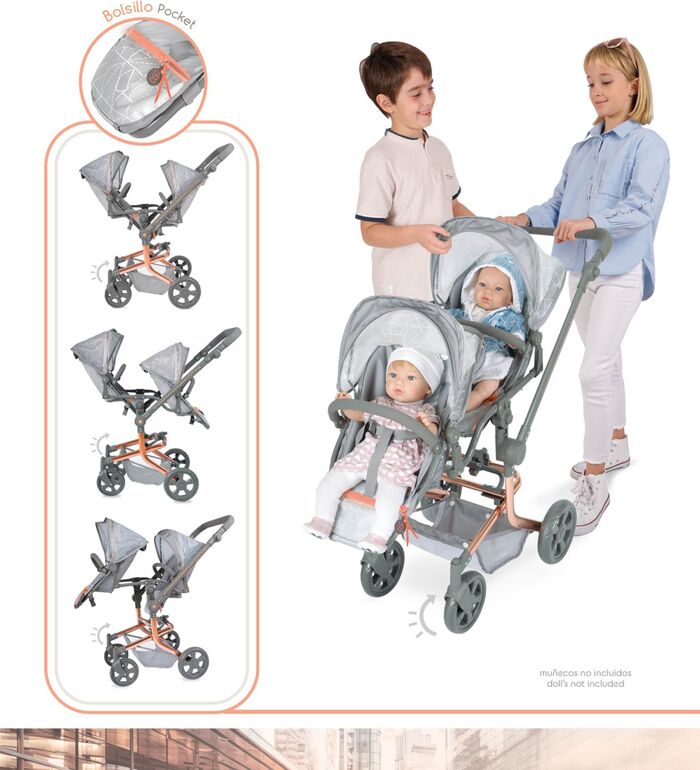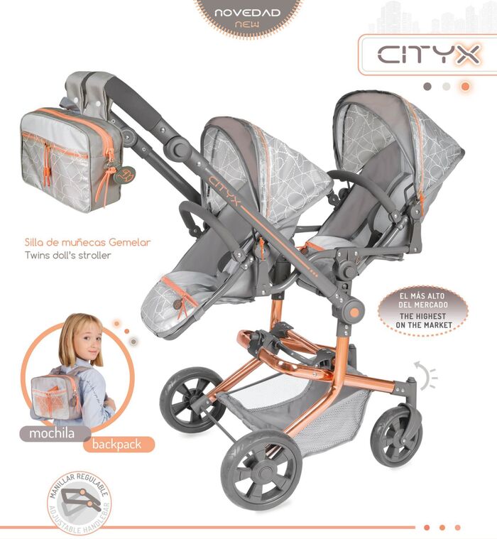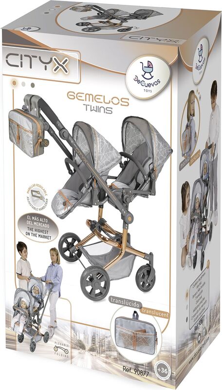 DeCuevas 90877 Skládací kočiarik pre dvojčatá s batôžkom CITY X je ideálny pre predškolské slečny, ktoré využijú jeho funkcie pri hre. Tento kočiarik si zaslúži obdiv za svoj dizajn, ktorý verne kopíruje moderné detské kočiare známych značiek. Odnímateľné športové korbičky umožňujú bezpečný prenos bábik. Po zložení nezaberá veľa miesta a je praktický na prevoz autom. Kolekcia CITY X predstavuje unikátne kombinácie materiálov a trendy dizajn, ktorý podčiarkuje vzdušnosť celej kolekcie. Nádherný španielsky dizajn, precízne spracovanie, skládací model a jednoduchá manipulácia. Odporúčaný vek: od 3 rokov.