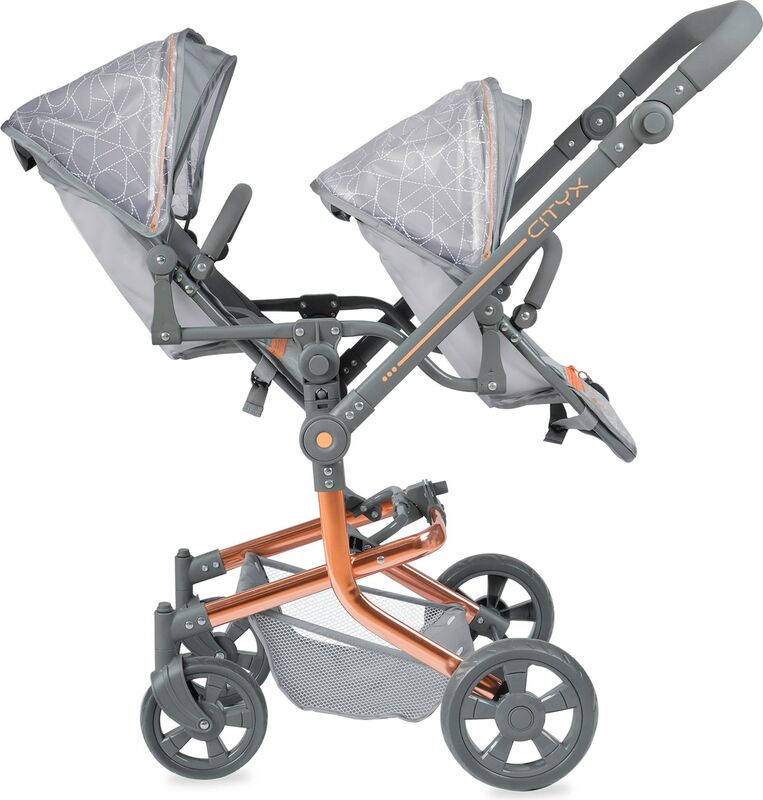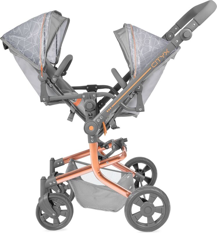 DeCuevas 90877 Skládací kočiarik pre dvojčatá s batôžkom CITY X, s výškou 91 cm, patrí do novej kolekcie roku 2024. Táto supermoderná kolekcia CITY X ponúka rôzne druhy kočiarikov a kombinuje nevšedné materiály. Štandardné látky sú doplnené o dizajnový materiál PVC s potlačou, ktorý vytvára efekt sklenenej plochy, čo je typické pre súčasné moderné mestá. Celá kolekcia v strieborno-sivej farbe je ozdobená trendy medenými prvkami, ktoré podčiarkujú ľahkosť a vzdušnosť celého výnimočného dizajnu.