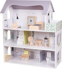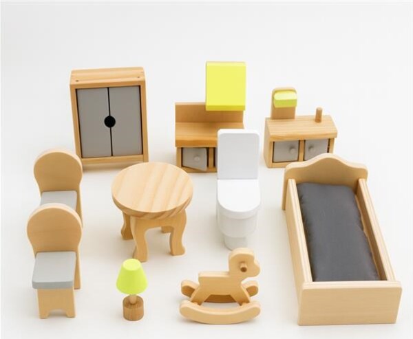 Obsahuje 10 kusov nábytku, ktoré podporujú kreatívnu hru a flexibilné usporiadanie. Realistické detaily a otvorený dizajn umožňujú ľahký prístup do všetkých miestností. Vysoko kvalitné materiály – masívne drevo + MDF – zaručujú odolnosť, stabilitu a bezpečnosť. Montessori dizajn podporuje nezávislosť, jemnú motoriku a rozvoj sociálnych zručností. Ideálne na hranie s bábikami a figúrkami rôznych veľkostí.
