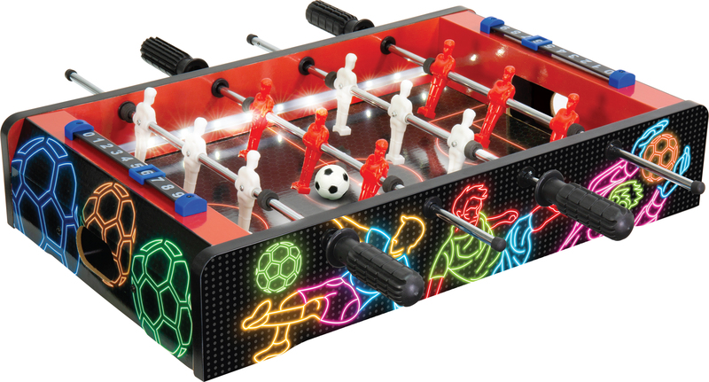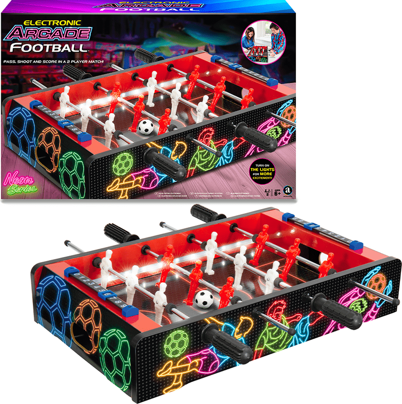Stolný futbal - Neon Series prináša vzrušenie arkádovej hry priamo k vám domov! Zahrajte si rýchlu futbalovú bitku so strelami na bránku, presnými prihrávkami a tvrdými súbojmi o loptu a zároveň si užite efektné LED osvetlenie hracej plochy.Pre 2 hráčov – súboje tvárou v tvár plnej zábavy a adrenalínu. Vstavané počítadlo zásahov – sledujte skóre a kto vedie.