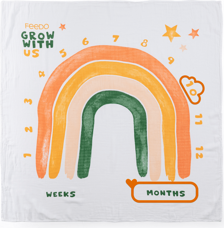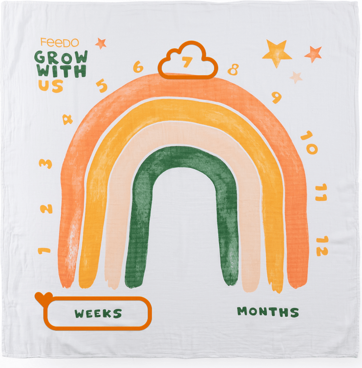 Zavinovačka s dizajnom dúhy slúži aj ako míľniková deka. Vzor umiestnený na nej a indikátory, ktoré sú súčasťou sady, umožňujú vytvoriť pamätné fotografie míľnikov vášho dieťatka od jedného mesiaca do jedného roka. Obláčik súži na označenie čísla, okienkom si vyberiete obdobie.