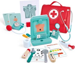 Ďalší pacient, prosím! Realistická lekárska súprava plná vzrušujúcich a funkčných doplnkov. Pomocou tejto súpravy môžu deti trénovať interakcie medzi lekárom a pacientom, čím si zlepšujú jazykové a komunikačné zručnosti. Môžu vysvetľovať diagnózy, dávať rady ohľadom zdravia a upokojovať svojich pacientov. Povzbudzovanie detí, aby sa počas hrania pýtali a odpovedali na otázky, ich pripravuje na skutočné sociálne situácie. Vlastnosti produktu: Realistické prístroje: Súprava obsahuje celý rad nástrojov, ktoré napodobňujú skutočné lekárske vybavenie, vrátane RTG prístroja s funkciou projekcie, tlakomera, stetoskopu, teplomera, otoskopu a ďalších. Vzdelávacie a interaktívne: Táto súprava učí deti o úlohe lekára hravou a interaktívnou formou. Pomáha im rozvíjať empatiu, zodpovednosť a základné životné zručnosti a zároveň zmierňuje prípadný strach z návštevy lekára. Podrobný RTG prístroj: RTG zariadenie má unikátnu funkciu projekcie a výmeny kariet, vďaka čomu si deti môžu zobraziť „snímky“ ako skutočný lekár. Funkčný tlakomer: Tlakomer je stlačiteľný a má pohyblivú ručičku, čo zvyšuje realističnosť a interaktivitu hry. Zlepšuje komunikáciu: Prostredníctvom hrania rolí si deti zlepšujú jazykové a komunikačné schopnosti pri interakcii s „pacientmi“. Rozvoj zmyslov: Jasné farby a aktivity, ktoré vyžadujú manipuláciu, stimulujú zmysly a jemnú motoriku detí, čím podporujú ich kognitívny vývin.