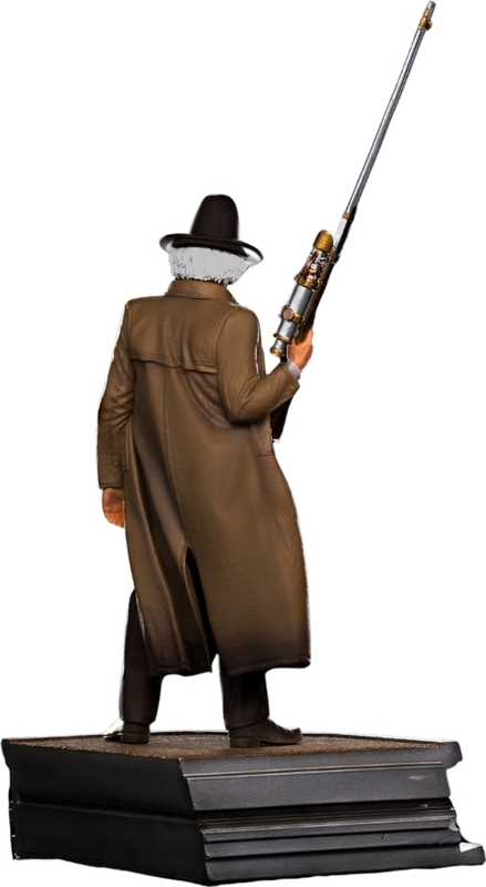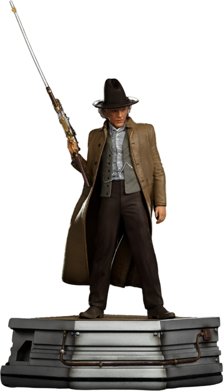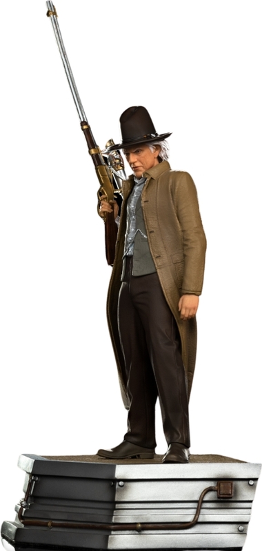 Figúrka Doc Brown – Back to the Future Part III – Art Scale 1/10 od Iron Studios zachytáva excentrického vynálezcu stroja času Dr. Emmetta Browna v jeho westernových šatách – pruhovaná košeľa, vesta s reťazou vrecových hodiniek, hnedé nohavice, čižmy a kovbojský klobúk, prikryté khaki plášťom. V rukách drží pušku Winchester 1866 „Yellow Boy" upravenú vlastnoručne vyrobeným ďalekohľadom. Figúrka je súčasťou diorámovej zostavy spolu s figúrkou Marty McFly – Back to the Future Part III – Art Scale 1/10 a vozidlom DeLorean III – Back to the Future Part III – Art Scale 1/10, inšpirovanej posledným dielom ikonickej filmovej trilógie Roberta Zemeckisa a Stevena Spielberga z roku 1990.