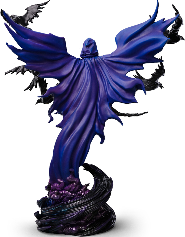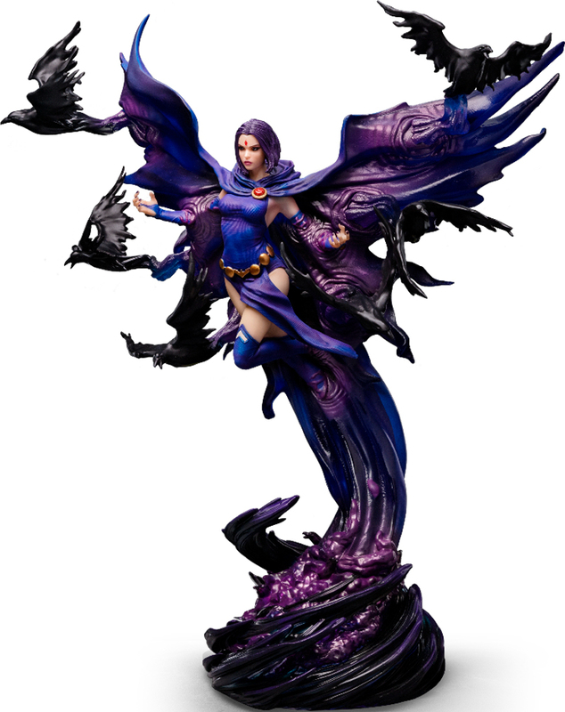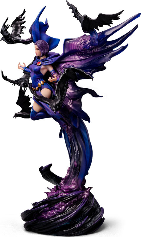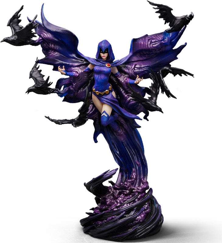 Figúrka Raven – DC Comics Series #8 – Art Scale 1/10 od Iron Studios zachytáva mystickú a mocnú polovičnú ľudskú a démonickú hrdinku – zakladajúcu členku skupiny New Teen Titans. Raven sa vznáša nad vírom tmavofialovej energie tvorenej zhustenými duchmi z inej dimenzie, ktorá nadobúda tvar dlhého plášťa splývajúceho s jej telom a roztvára sa ako veľké krídla. Z plášťa vylietajú čierne havrany ako kúzla vrhané jej rozpaženými rukami. Figúrka obsahuje náhradnú vymeniteľnú hlavu bez kapucne, odhaľujúcu celú jej tvár, vybranú fanúšikmi a zberateľmi.
