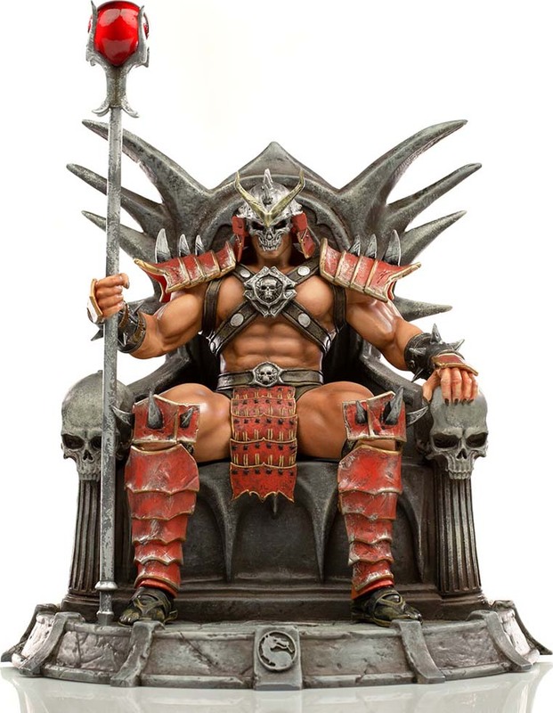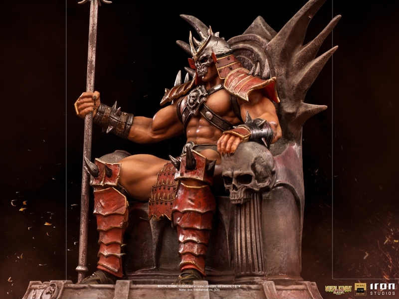 Na tróne vytesanom do skaly vo svojom prastarom paláci v zdevastovanom kráľovstve Outworld – starobylom mimodimenzionálnom svete ovládanom chaosom – panuje absolútnou mocou impozantný Emperor Shao Kahn. Jednou zo svojich mocných pästi zviera svoju palicu, druhou sa opiera o lakťovník trónu zdobený lebkami, pričom jeho tvár skrýva charakteristická helma v tvare lebky. Táto dlho očakávaná figúrka mocného dobyváka svetov pochádza zo série sôch Mortal Kombat od Iron Studios a je inšpirovaná hrou Mortal Kombat II.