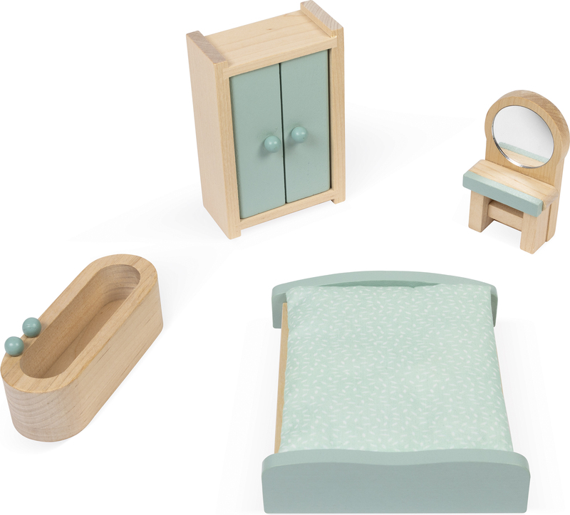 Dodáva sa so 4 postavičkami, je tiež kompatibilný s postavičkami do veľkosti približne 11,5 cm a obsahuje 11 doplnkov na usporiadanie podľa vašich predstáv: skriňa s otváracími dverami, posteľ s prikrývkou, toaletný stolík, vaňa, pohovka, lampa, stôl, dve stoličky a kuchynka. Jednoduchá montáž pre okamžitú zábavu!