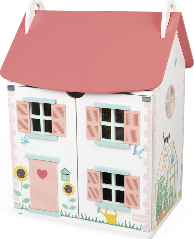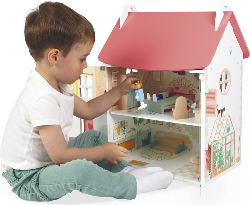 Vitajte v očarujúcom svete tohto nádherného trojposchodového domčeka pre bábiky!Je plný šarmu a krásne zdobený a obsahuje kusy zladeného nábytku a 4 rozkošné drevené postavičky pre vymýšľanie nekonečných príbehov! Otvorte dvere a objavte každú izbu, obývačku, jedáleň, spálňu... rozložte nábytok, oživte svoje postavičky... potom všetko opäť zatvorte pre jednoduché uskladnenie. S ružovými kockami, motýľmi a miniatúrnymi stromčekmi tento domček vyžaruje jemnú, rozmarnú atmosféru.