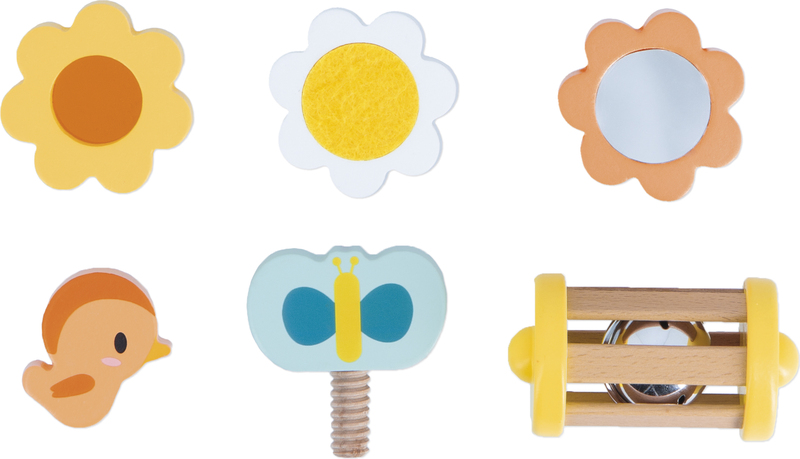 Hrkálka a motýlik na skrutkovanie sa dajú umiestniť na chrbát. Kvety sa dajú umiestniť po stranách. Bábätko objaví zrkadielko, časť na škrabanie a priehľadnú plachtu, aby videlo život v oranžovej farbe.