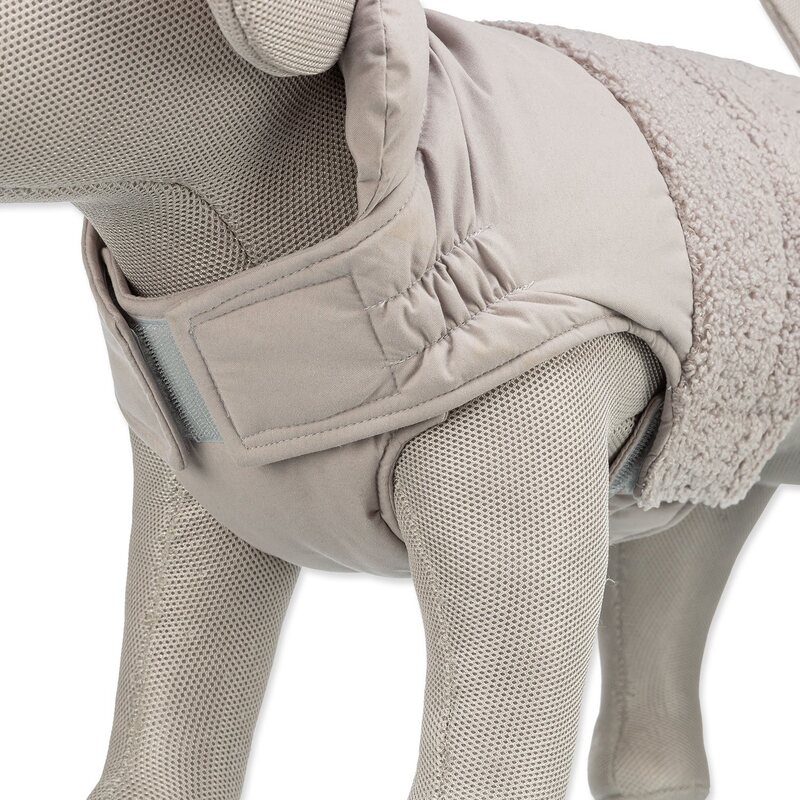 Bunda má vodoodpudivý povrch, takže si poradí s jemným dažďom aj snehom. Praktické zapínanie na suchý zips v oblasti hrudníka a brucha uľahčuje obliekanie a skvele sedí väčšine psov. Dekoratívne kapsičky dodávajú bunde štýl a štipku originality.