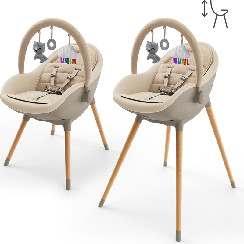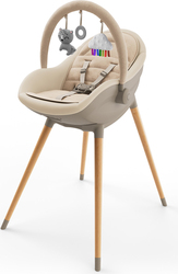 Súčasťou balenia je tiež mäkká novorodenecká vložka a hrazdička s tromi hračkami - drobnosť, ktorá zabaví ručičky a rodičom dopraje krátku, pokojnejšiu chvíľku. Celkový vzhľad dotvára bukové nohy, tlmené farby a mäkké materiály – FINI UP pôsobí ako premyslený kus nábytku, ktorý je súčasťou interiéru, nie ako „dočasná“ výbava. Po BLW nie je upratovanie boj - sedák aj pultík stačí rýchlo utrieť.
