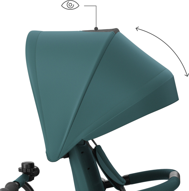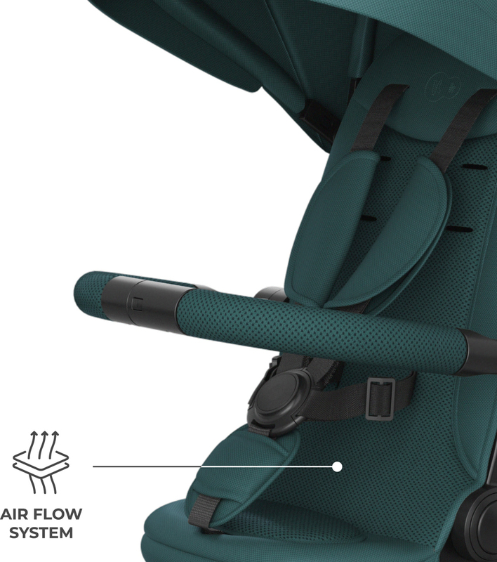 Na dlhších trasách výrazne pomáha pololežiaca poloha, dostupná ako po smere jazdy, tak proti smeru jazdy. Keď dieťa únavou zavrie oči, rodič rýchlo sklopí opierku a pokračuje v prechádzke bez narušenia denného rytmu. Pri jazde proti smeru jazdy môže dieťa odpočívať a vidieť na starajúcu osobu, čo často uľahčuje upokojenie a zaisťuje maximálny pocit bezpečia. Pohodlie dopĺňajú ventilované vložky AIR FLOW a nastaviteľná strieška s okienkom - ľahko ju prispôsobíte počasiu a počas jazdy na dieťa vidíte.