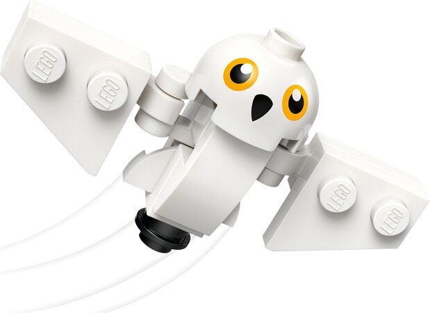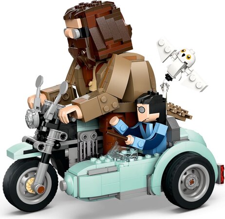 - 3 postavy LEGO® Harry Potter™ z kociek – Model obsahuje vstavané polohovateľné figúrky Harryho Pottera, Hedvigy a Rubeusa Hagrida, ktorí jazdia na Hagridovej lietajúcej motorke a postrannom vozíku