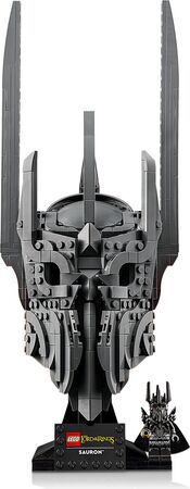 ČO NÁJDETE V BALENÍ – Obsahuje všetko potrebné na zostavenie repliky Sauronovej helmy, výstavný podstavec a ceduľku spolu s minifigúrkou Saurona, ktorý drží Prsteň moci