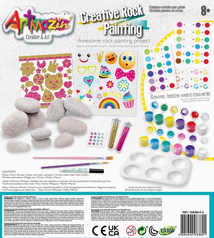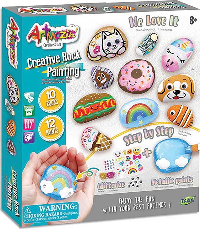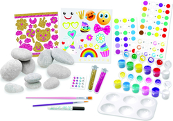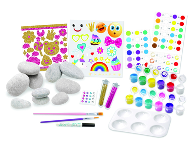 - Sada obsahuje: 10 kamienkov, 2x6x vodovej farby, 2 štetce, 3 nádobky s trblietkami samolepky a fix.