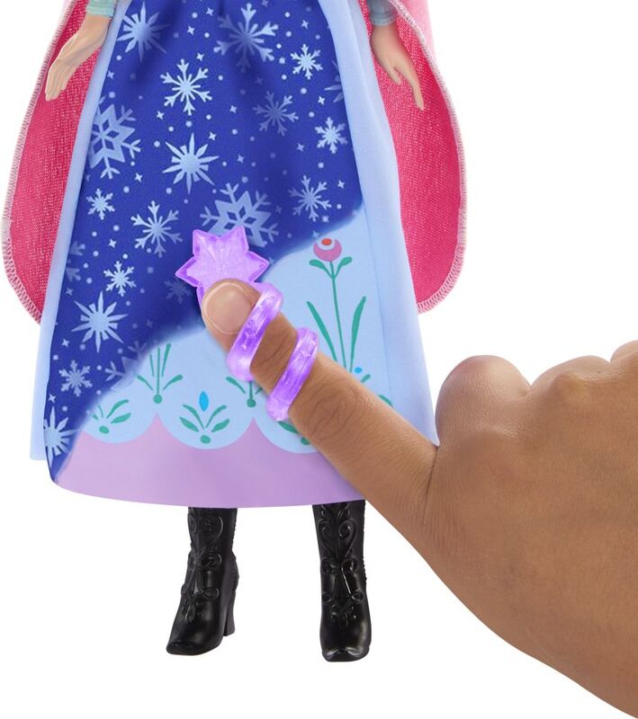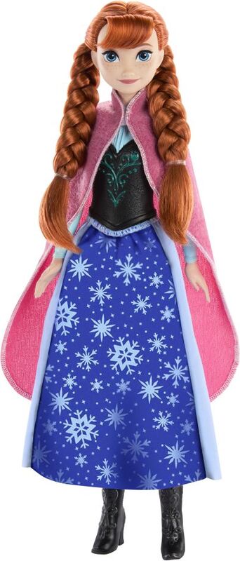 Bábika Magical Skirt Anna, inšpirovaná animovanou postavičkou v Disney's Frozen, má na sebe svoj typický vzhľad z filmu s jemnou sukňou so zmenou farby, odnímateľným plášťom a čižmami.
