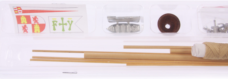 Balenie obsahuje hotový polotovar trupu, preglejkové diely, drevené lišty, blister s drobnými dielmi, sadu výkresov a anglický návod.