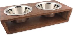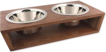 Praktická sada dvoch nerezových misiek v elegantnom drevenom stojane. Ideálne riešenie na podávanie vody aj krmiva, ktoré spája funkčnosť a moderný dizajn.