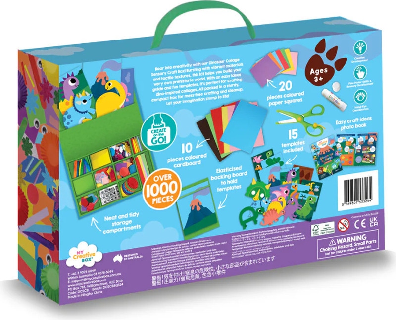 Vo vnútri nájdete knižku s kreatívnymi nápadmi plnú inšpirácie a viac než 1000 dielikov vrátane lepidla, bezpečnostných nožníc, austrálskych ilustrovaných šablón, praktickej podložky na tvorenie a základných výtvarných potrieb. Všetko, čo potrebujete na hodiny senzorického kolážového tvorenia, je prehľadne uložené v pevnom a prenosnom boxe.