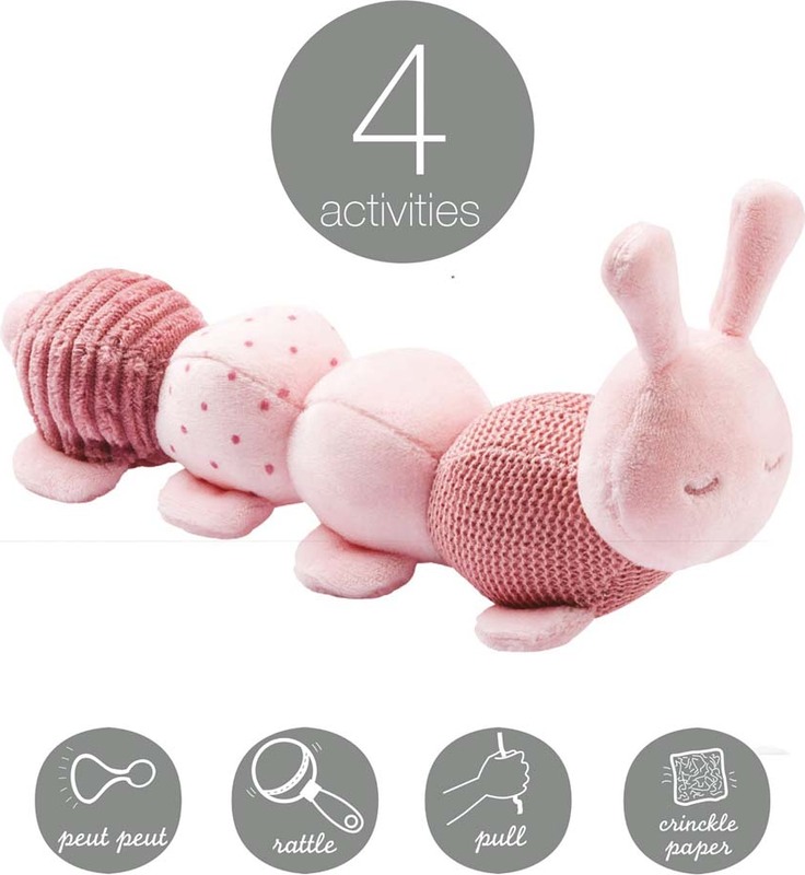 Táto roztomilá húsenička Lapidou od Nattou ponúka množstvo stimulov na aktivity, kde inovatívne prvky podporujú rozvoj všetkých zmyslov vášho dieťatka. Hrajte sa, maznajte sa a trénujte svoje motorické schopnosti hravou formou. Veľmi mäkké materiály, rôzne textílie, povrchy a zvuky priťahujú dotyky a pozornosť vašich malých prieskumníkov. Vďaka ľahko uchopiteľnému tvaru je húsenica Lapidou skvelým spoločníkom pre batoľatá a deti.