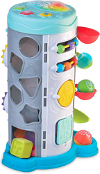 Medzi farebnými stenami hračky sa skrýva 5 rôznych aktivít: šmykľavka s loptičkami, ozubené kolieska na točenie, tvarový sorter s kockami, pohyblivé prvky na posúvanie a otáčanie, a tiež na samom vrchole roztomilý mráčik s tlačidlami aktivujúcimi melódie a farebné svetelné vzory.