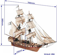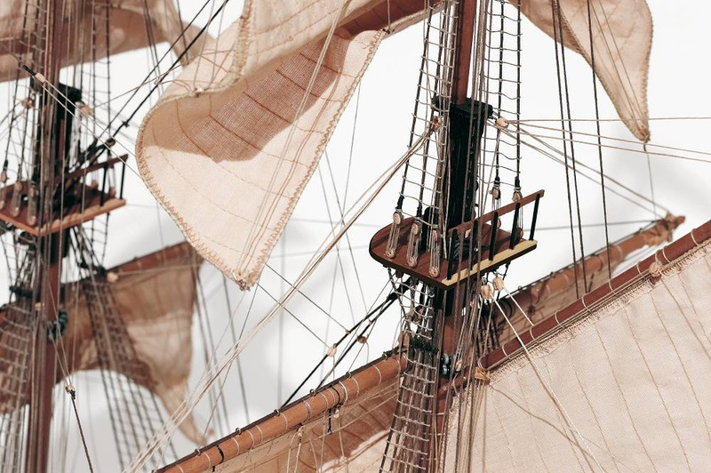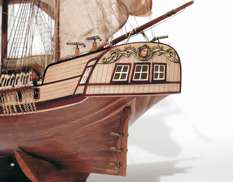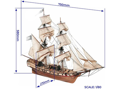 Balenie obsahuje laserom rezané plošné drevené diely, plaňky, stožiare, frézované drevené diely, kovové odliatky, mosadzné diely, lanoví, ušité plachty, stojan. Návod a stavebné výkresy.