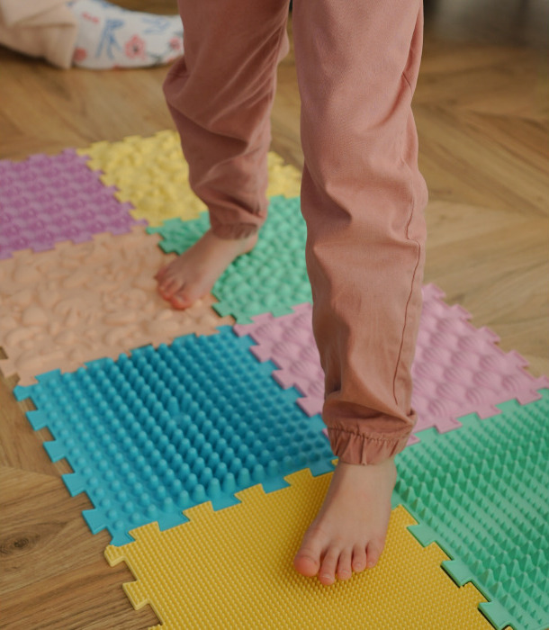 Uskutočnili sme celú demonštračnú aktivitu na masážnej podložke Ortek. Dieťa poskladá hádanky, vy pustíte video - dieťa to urobí! Robíte to 3-5-krát týždenne. Už po jednom mesiaci činnosti sú viditeľné výsledky. Ich svaly sa posilnia a ich chôdza bude istejšia.